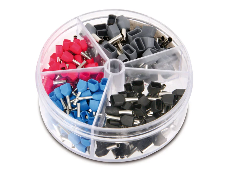 Farbig isoliert, für jeweils 2 Leiter des entsprechenden Querschnitts. Vier Sorten in der praktischen Streudose: 50x blau (0,75 mm²), 50x rot (1 mm²), 50x schwarz (1,5 mm²), 50x grau (2,5 mm²).